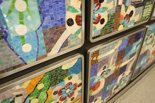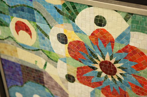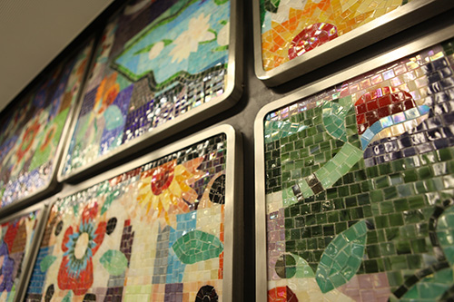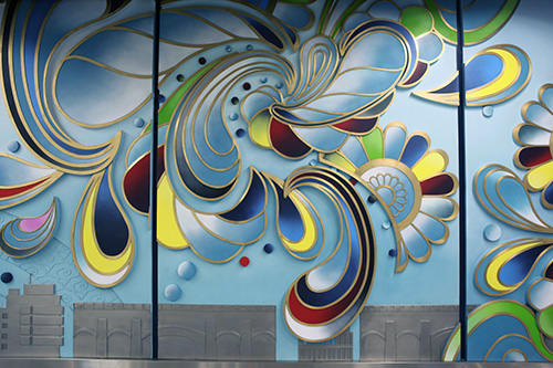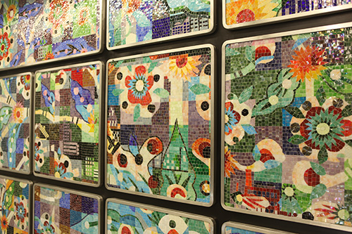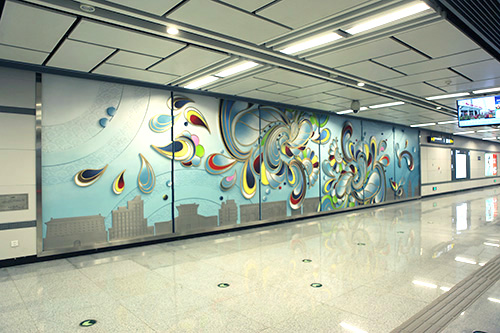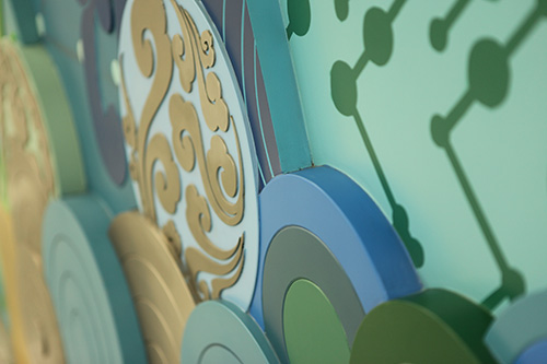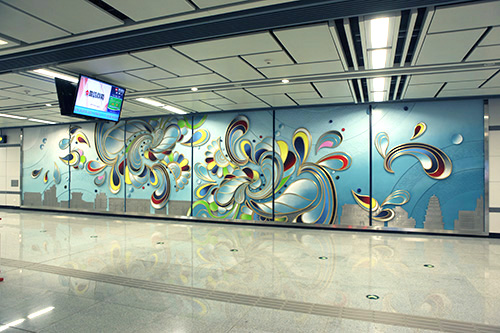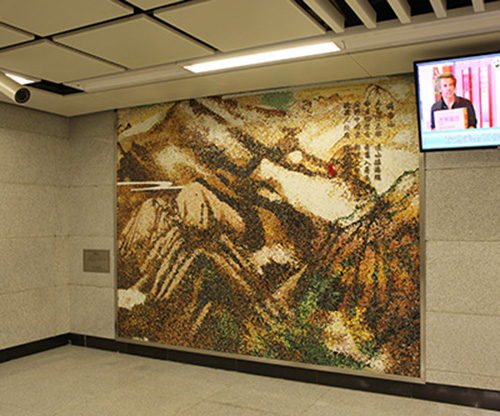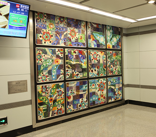 作品提取陜西特有的彩色剪紙?jiān)兀Y(jié)合現(xiàn)代建筑,利用馬賽克的表現(xiàn)手法,展現(xiàn)西安人民豐富多彩的幸福生活。