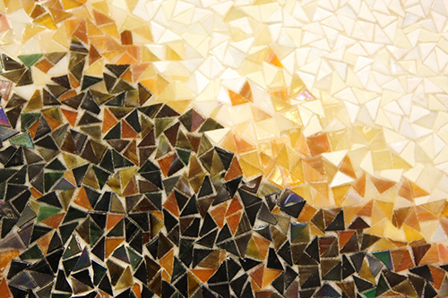 作品融合王維“詩(shī)中有畫,畫中有詩(shī)”的美學(xué)概念,形象的表現(xiàn)出觀者夕陽(yáng)下遠(yuǎn)眺終南山,金色余暉中山頂一抹殘雪的壯美景象。