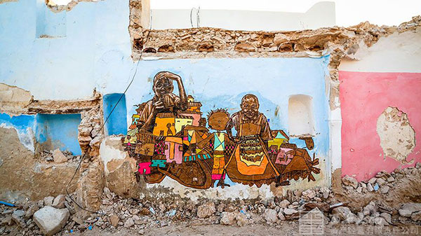 在突尼斯最古老的村莊之一杰爾巴島上的Erradh村,法國Itinerrance畫廊承辦了一個(gè)被命名為“杰爾巴歲月”的計(jì)劃,他們邀請了30個(gè)國家的150名街頭藝術(shù)家上島,在這座古老村莊里的房門和建筑墻上留下了他們的壁畫作品,使這個(gè)小鎮(zhèn)變成了一個(gè)露天藝術(shù)館。