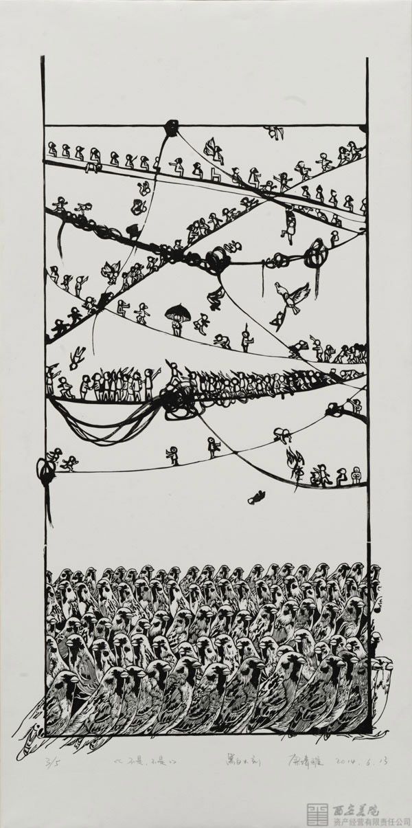《不是不是》更能表現世道的浮躁。畫面有意將現實中人和麻雀的位置進行對調?;蛟S,掙扎在溫飽線上又無過多欲望的鳥獸,才是安靜的。人們嘰嘰喳喳地吵嚷,奔向各自不同的方向,有人安于現狀,有人得隴望蜀,有人借助外力上升,有人失足墜落,更有人閑來當看客,原地蹉跎……世界很大,有無數種可能,但是人太渺小,奮斗了許久,大多數人還是在走獨木橋。
