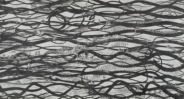 《藏》和《力爭上游吧》,都借鑒了兒童的觀畫視角。畫面沒有中心,人們在看畫的時候,會像孩子一樣,從某個細節(jié)挨個看去??吹搅巳藗?yōu)榱瞬煌姆较蛟谝粭l船上相互爭吵,看到了人們?yōu)榱烁鞣N目的尋找翅膀,有些人飛了,有些人墜了……第一眼看上去,畫面還算熱鬧,細看上去,畫面簡直滿是喧囂。在洶涌不已的水波中,人是那么小,又那么的不滿足。“力爭上游”是個好詞,教人勵志,后綴一個“吧”字,則充滿了質疑、調侃、猶豫。我們看似努力地去追求很多事情,真的能夠到達我們真正想去的地方么?水無常勢,世無常態(tài),爭與不爭,何去何從?