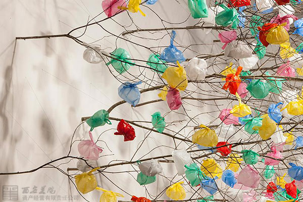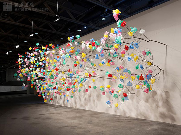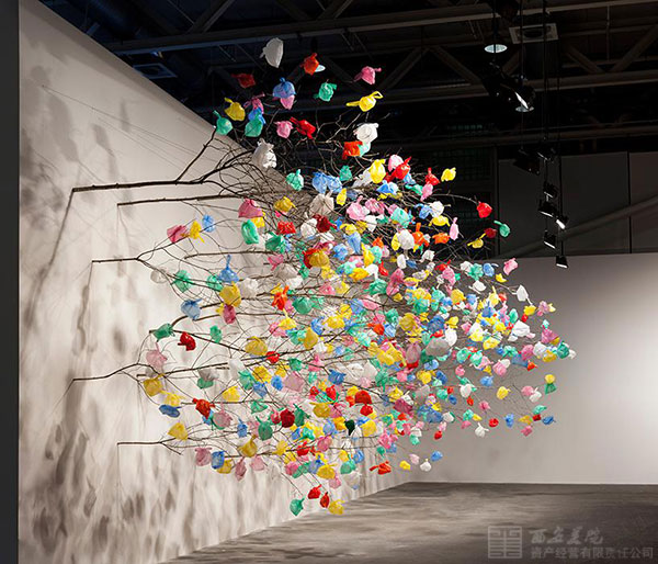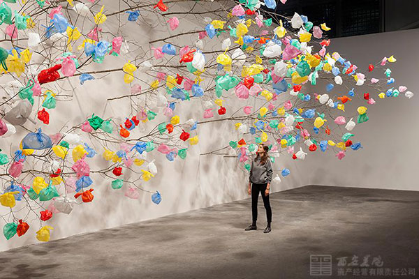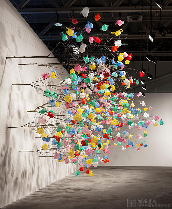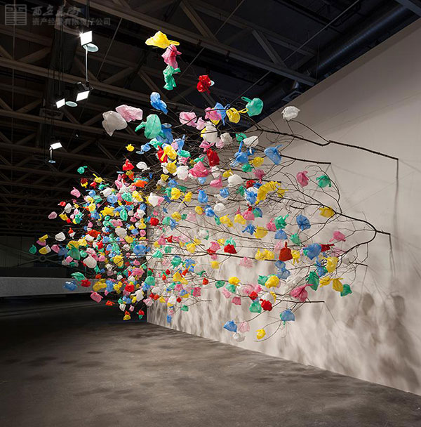 樹(shù)枝有粗又細(xì)、有疏有密,均沿著水平方向生長(zhǎng),這與我們?nèi)粘I钪兴吹降拇怪鄙L(zhǎng)的樹(shù)木有著天然之別,棕色樹(shù)枝的末梢上更是十分隨意地掛著各種色彩艷麗的塑料袋。該作品旨在通過(guò)視覺(jué)象征的形式警示人們污染和過(guò)度消費(fèi)對(duì)環(huán)境帶來(lái)的危害,同時(shí)也致力于研究塑料材料作為一種藝術(shù)創(chuàng)作媒介所擁有的潛能,以及在藝術(shù)創(chuàng)作中如何將塑料材料與天然材料相結(jié)合。