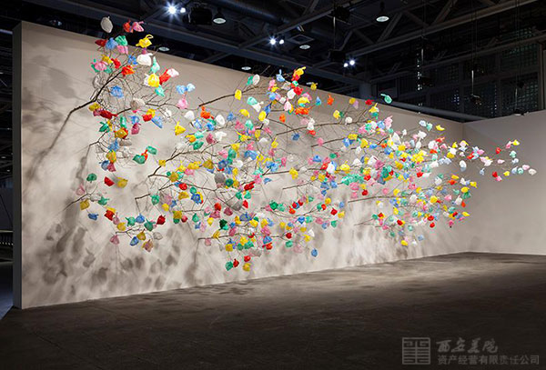 在2015年巴塞爾藝術(shù)博覽會(huì)的無(wú)限展區(qū)里,這里獨(dú)一無(wú)二的展覽平臺(tái)超越了任何一場(chǎng)傳統(tǒng)藝術(shù)博覽會(huì)。常青畫(huà)廊是這次展覽的舉辦場(chǎng)所,在眾多藝術(shù)裝置作品中,一件由喀麥隆藝術(shù)家帕斯卡爾?馬爾蒂那?塔尤(Pascale Marthine Tayou)設(shè)計(jì)制作的作品尤為出眾。作品名為《拾荒者的春天(Plastic Tree)》,被安裝在展館里的一面長(zhǎng)方形白墻上,纖細(xì)的樹(shù)干從墻體里垂直地生長(zhǎng)出來(lái),樹(shù)枝上還掛著五顏六色的塑料袋。作品的高度使參觀者可以站在樹(shù)枝底下欣賞作品。