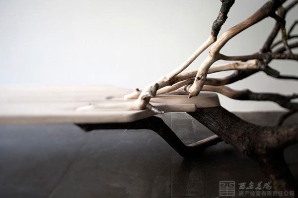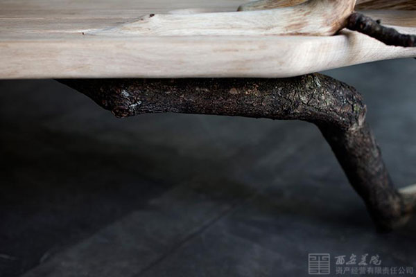 ↓設(shè)計(jì)師使用一整棵樹(shù)作為原材料,剝?nèi)?shù)干和部分樹(shù)枝的樹(shù)皮,并將樹(shù)干部分加工處理成木板狀,作為長(zhǎng)椅的座面