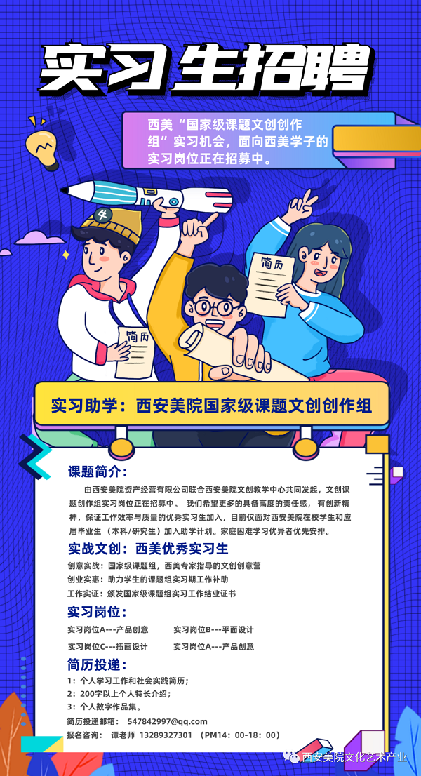 課題介紹:中華優(yōu)秀文化資源開放共享與開發(fā)復(fù)用技術(shù) 立足于西安美術(shù)學(xué)院的學(xué)科優(yōu)勢和人才優(yōu)勢,本項(xiàng)目課題由西安美院資產(chǎn)公司承擔(dān)與組織,研究湖南大學(xué)岳麓書院與湖南省博物館馬王堆漢墓所代表的湖湘地區(qū)中華優(yōu)秀文化資源,以文創(chuàng)產(chǎn)品為核心,研發(fā)其特有的文化要素與文化符號(hào);進(jìn)行包括視覺傳達(dá)/產(chǎn)品設(shè)計(jì)/數(shù)字媒體與博物館/建筑環(huán)境藝術(shù)設(shè)計(jì)/服裝與服飾設(shè)計(jì)等全方位的示范。 實(shí)習(xí)助學(xué):西安美院國家級(jí)課題文創(chuàng)創(chuàng)作組 創(chuàng)意實(shí)戰(zhàn):國家級(jí)課題組,西美專家指導(dǎo)的文創(chuàng)創(chuàng)意營 創(chuàng)業(yè)實(shí)惠:助力學(xué)生的課題組實(shí)習(xí)期工作補(bǔ)助 工作實(shí)證:頒發(fā)國家級(jí)課題組實(shí)習(xí)工作結(jié)業(yè)證書 實(shí)戰(zhàn)文創(chuàng):西美優(yōu)秀實(shí)習(xí)生 由西安美院資產(chǎn)經(jīng)營有限公司聯(lián)合西安美院文創(chuàng)教學(xué)中心共同發(fā)起,文創(chuàng)課題創(chuàng)作組實(shí)習(xí)崗位正在招募中。我們希望更多的具備高度的責(zé)任感,有創(chuàng)新精神,保證工作效率與質(zhì)量的優(yōu)秀實(shí)習(xí)生加入,目前僅面對(duì)西安美院在校學(xué)生和應(yīng)屆畢業(yè)生(本科/研究生)加入助學(xué)計(jì)劃。家庭困難學(xué)習(xí)優(yōu)異者優(yōu)先安排。 實(shí)習(xí)崗位A---產(chǎn)品創(chuàng)意 實(shí)習(xí)崗位B---平面設(shè)計(jì) 實(shí)習(xí)崗位C---插畫設(shè)計(jì) 實(shí)習(xí)崗位D---動(dòng)畫設(shè)計(jì) 計(jì)劃執(zhí)行: 西安美院資產(chǎn)經(jīng)營有限公司 西安美院文創(chuàng)教學(xué)中心 簡歷投遞: 1:個(gè)人學(xué)習(xí)工作和社會(huì)實(shí)踐簡歷;2:200字以上個(gè)人特長介紹;3:個(gè)人數(shù)字作品集。 簡歷投遞郵箱: [email protected]