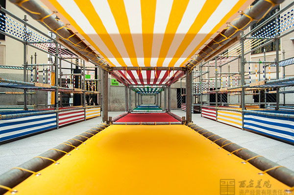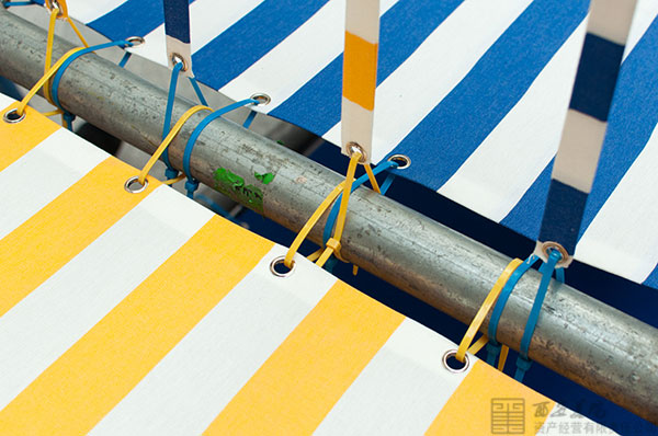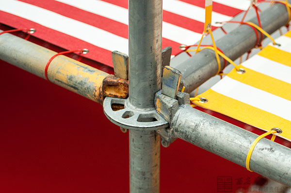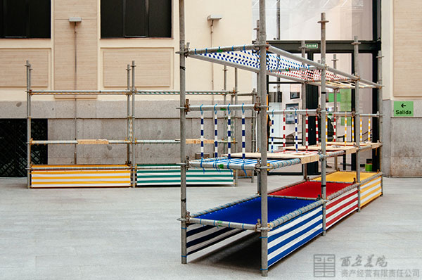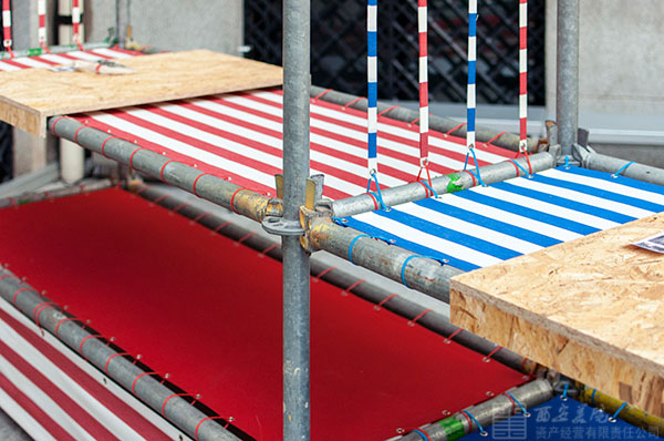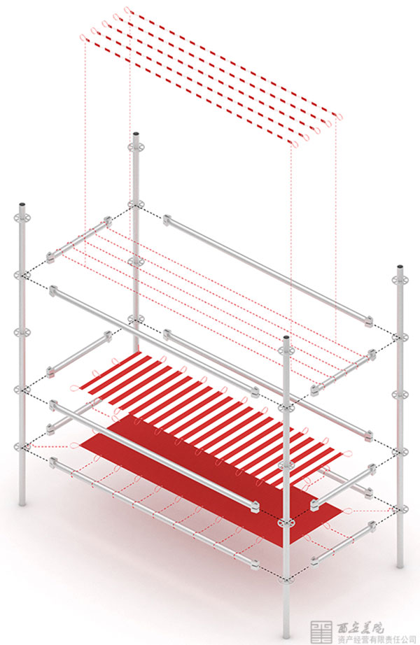 ↓彩色韁繩將帆布與腳手架結(jié)構(gòu)連接起來(lái),形成一個(gè)拉伸的平面