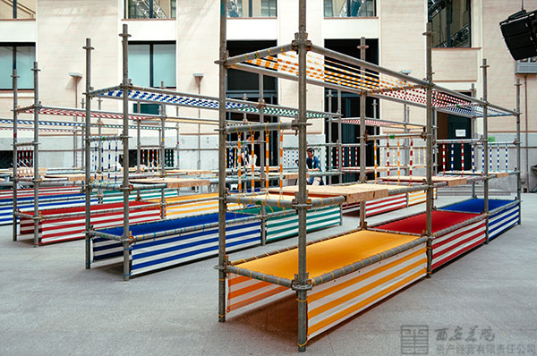 , 0px">組成,用塑料扎線帶將帆布與金屬架連接。在展架最頂層的兩條金屬管之間拉著幾根繃緊的繩子,可以用來(lái)垂掛各種物品,并且高度正好與人們眼睛的高度持平。沒(méi)有添加任何成本或借助其它元素,一張簡(jiǎn)單色調(diào)的帆布就將展會(huì)熱鬧的氣氛襯托地恰到好處。如何延長(zhǎng)材料的使用壽命是這項(xiàng)設(shè)計(jì)中的一個(gè)重點(diǎn)問(wèn)題。那些專(zhuān)門(mén)為這次展會(huì)租來(lái)的腳手架可以直接存放在倉(cāng)庫(kù)里或是繼續(xù)被用到別的活動(dòng)中。帆布則有點(diǎn)棘手,但相對(duì)來(lái)說(shuō)它比較容易被重復(fù)再利用。它們可以再次作為設(shè)計(jì)師的創(chuàng)作材料,或是做成其它展會(huì)的標(biāo)志和展示工具,又或者是做成窗簾、桌布和沙灘袋??偟膩?lái)說(shuō),這種展架即操作簡(jiǎn)單又可行,最重要的是,不產(chǎn)生任何浪費(fèi)。
